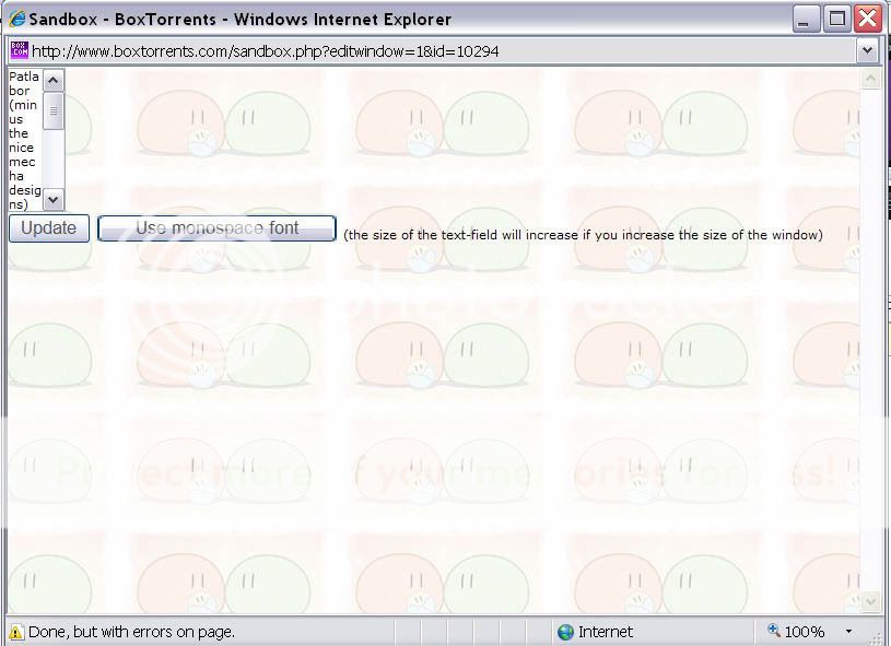 I was still able to edit a torrent by copying the text in the sandbox editor into wordpad and then pasting it back when done.  ;)