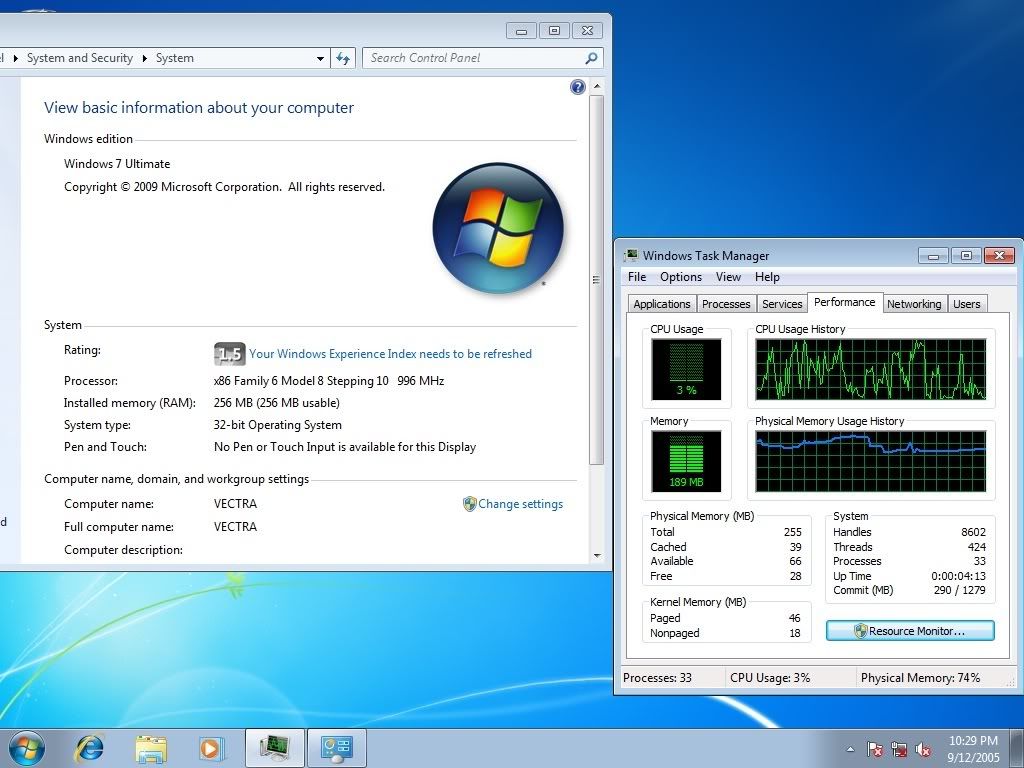 Here it is again, running just fine on 512MB of RAM with Aero and then without. The score has gone up from 1 in the beta to a 1.7