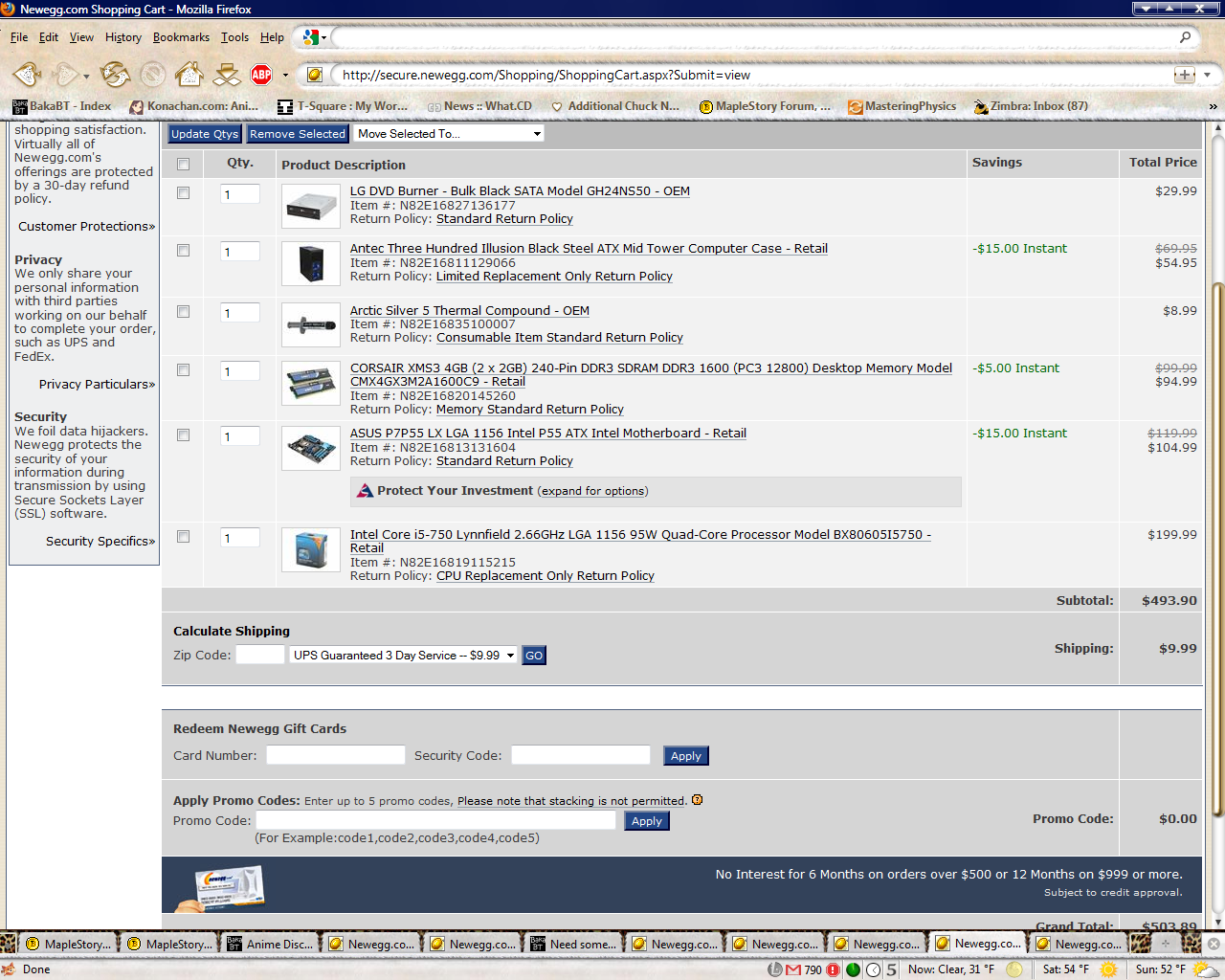 Anyways, it looks really good. That case is pretty much unbeatable for me, because it includes like 4 fans out of the box, and the fans look like they're pretty decent quality, too (though I wish they'd lose the damn lights; at this rate, I guess I'll have to put some kind of tent over it when I go to sleep. >_>). It has a 10 dollar shipping fee (notice how everything else on my list is free shipping), but eh what the heck... 4 extra fans > 10 dollar shipping fee.